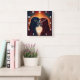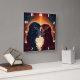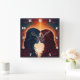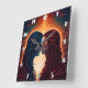 Two women with flowing hair gently kiss, surrounded by a vibrant fiery backdrop, creating an intense and passionate atmosphere.