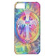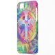 Tye Dye Cross by Amelia Carrie features a bright white cross with a small rainbow coloured heart in the centre of it. In the background their is a peace symbol.