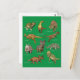 Dinosaurs postcard with several less common types of dinosaurs in color illustrations with their names on a green background. They are NOT TO SCALE, just for fun, great for kids or other dinosaur lovers. The detail is interesting and the faces are expressive. The types include Styracosaurus, Nanyangosaurus, Afrovenator, Zalmoxes, Megalosaurus, Achelosauras, Pentaceratops, Gastonia, Anchiceratops, and Avaceratops.