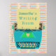 This pretty wall poster design for creative writers / novelists / journalists and any other sort of author has a pretty bright aqua blue typewriter drawing on it. The vintage 60s - style typewriter has a heart in the middle and its paper says, "[Your Name]'s Writing Room." The background has a light ink pen repeating pattern with a watercolor / painted effect.