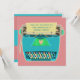 These cute vintage typewriter invitations have a retro, 60s-style aqua blue typewriter on the front, drawn in a modern style with a heart and colourful keys. The background has a pastel ink pen pattern.