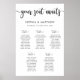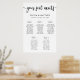 Personalise this modern monochrome typography small wedding seating chart with your own details easily and quickly, simply press the customise it button to further re-arrange and format the style and placement of the text. (c) The Happy Cat Studio