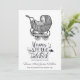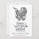 A whimsical illustrated typography saying: mama's little sidekick coming soon, complemented by a cute vintage baby carriage. Black and white.