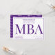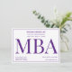 An MBA graduation party invitation in purple and white. This invitation also has a pattern of the word MBA on the back.