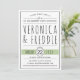 Modern black and white typography wedding engagement party invitation accented with sage green colour. It features your text in black on white and the date of your party on a green banner. The back includes a pattern with white crosses on sage.