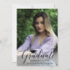 Photo on front and back... Carefree script graduation invitation announcement with mortarboard graduation cap icon, perfect for the high school or college grad. Modern minimalist typography, casual elegant script "Graduate" writing. Capture those special moments of growth and smiles of joy and youthfulness for all time. Upload a full portrait-mode cover photo of the graduate on front, and a landscape orientation photo als well as pertinent details of the graduation party on back. Automatically shades the perfect areas of the pic.