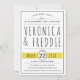 Modern black and white typography wedding engagement party invitation accented with yellow colour. It features your text in black on white and the date of your party on a yellow banner. The back includes a pattern with white crosses on yellow.