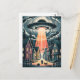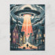 This dramatic illustration depicts a UFO hovering above a quiet suburban street at dusk, casting a vivid orange-yellow beam over houses and a lone figure observing the spectacle. Rich, moody colors of deep blues, purples, and grays contrast with the glowing beam, creating a retro-inspired, surreal atmosphere. Bold outlines and stylized details make this artwork perfect for fans of sci-fi, mysterious phenomena, and cinematic night scenes.