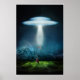 ufo and child in field at night poster. This poster depicts an innocent child and an encounter at night with a UFO in a field. The childs tricycle can be seen being beamed aboard the UFO ship while the child sits below the beam. This surreal image poster has a haunting quality and is one of a series of strange and wonderful science fiction photo posters.