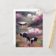 Unsuspecting black and white Holsteins grazing in a field while a spaceship hovers in the distance. Just another typical cow abduction on the old MacDonald farm. Wombo Dream AI and artist collaboration.