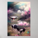 Unsuspecting black and white Holsteins grazing in a field while a spaceship hovers in the distance. Another typical cow abduction on the old MacDonald farm. Wombo Dream AI and artist collaboration.