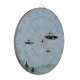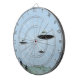 A watercolor of three saucer UFOs over the mountains adorns this fun dartboard!