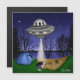 Hand drawn alien art. UFO trying to abduct a man camping by the lake in the forest.