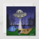 Hand drawn alien art. UFO trying to abduct a man camping by the lake in the forest.