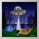 Hand drawn alien art. UFO trying to abduct a man camping by the lake in the forest.