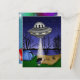 Hand drawn alien art. UFO trying to abduct a man camping by the lake in the forest.