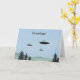 A watercolor, pen and ink, and colour pencil drawing of three saucer UFOs over the mountains adorns this greeting card.