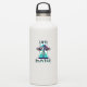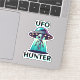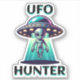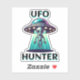 Alien and UFO graphic for those into UFOlogy. A cute alien being breamed down from a UFO. Text says, "UFO Hunter" in black and turquoise stickers.