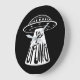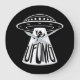 Vector cartoon illustration of a UFO abducting a person that thinks aliens rock with UFOMG text. Tags: UFO, OMG, unidentified, flying, object, oh, my, god, space, spaceship, alien, martian, cartoon, devil, horns, abduction, fourth, kind, humour, saucer