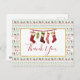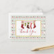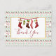 Christmas party invitation with a repeating pattern in the background, in an ugly Christmas sweater style. The pattern is composed of socks, christmas balls, stars and snowflakes. With the repeating Merry Christmas text in red. Fun and festive. Layered over top is a white rectangle with a faux gold foil border, inside is an illustration of old-fashioned hanging stockings and Thank You written inside. Message on the back you can personalise.
