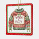 Having an Ugly Christmas Sweater Party? Well, you have to award a prize fo the "ugliest" one! This ornament has a Christmas sweater on the front that is red and green with white snowflakes and says "Warm and Fuzzy" in the middle. There are alternating red and green bows going up the sleeves and across the neckline, giving it that "Ugly Sweater" look. There's a red and white polka dot background. The reverse side is also a red with white polka dot background and green bows in the top corners. Typography says "Congratulations" 1st Prize in the "UGLY SWEATER" CONTEST, The year and at the bottom it says "Please display this Ugly Sweater Award with pride on your tree." Whoever is selected for 1st Prize at your party will be so excited! Such a fun ornament to hang on their Christmas tree every year.
