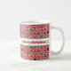 This Ugly sweater Christmas mug is based off of the theme of Fair Isle knitted designs which is also ugly sweater Christmas too. The pattern is of red and white circles and diamond stripes. Each shape has a different Christmas themed motif. There is a Christmas tree, reindeer, bell with a bow, two Christmas ornaments, Santa’s hat, snowman’s top hat and a snowflake. In-between the shapes are little trees, snowflake and a present. Personalise this coffee mug with your own saying or name or keep the Merry Christmas that is already on the design.