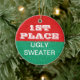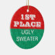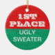 Funny 1st Place Ugly Sweater Contest winner ornament- Reads '1st Place Ugly Sweater' on red and green sweater background. Same on both sides. Fun Christmas party favour for Ugly Sweater Contest.