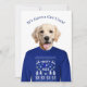 Golden retriever wearing blue Christmas ugly sweater for Ugly Sweater Christmas Party.