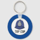 A fun gift for the best policeman or police constable. Gift key fob for a Top Cop policeman. Police helmet design key ring. Police constable helmet illustration on a keyring.