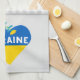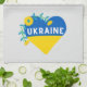 Sweet kitchen towel design supporting the people of Ukraine features heart shaped Ukrainian flag in blue and yellow with a vine of flowers and centre Ukraine text on grey and white gingham plaid background