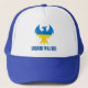 An inspirational hat design that echoes the resilience of the Ukrainian people, features a phoenix bird silhouette in the blue and yellow colours of Ukraine's flag with "Ukraine will rise" text in distressed font.