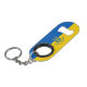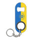 Keychain bottle opener with the flag of Ukraine, a blue and yellow flag with the Ukrainian coat of arms (emblem) with a trident in the centre, and a custom text template for your message