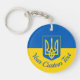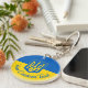 Round acrylic keychain with the flag of Ukraine, a blue and yellow flag with the Ukrainian coat of arms (emblem) with a trident in the centre, and a custom text template for your message