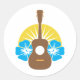 A stylised ukulele, sitting on a background of Hibiscus flowers over a sunburst semi-circle.
