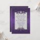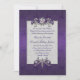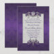 Chic iridescent purple damask wedding invitation, with graphics of a silver tone frame decorated, with elegant floral jewels and a pearl white text area. Personalise all the text to suit your wedding needs. Matching products are available.