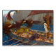 Ulysses and the Sirens by Pre-Raphaelite painter John William Waterhouse, oil on canvas 1891, depicts the dangerous beauties from Greek mythology whose enchanting songs lured passing sailors to shipwreck and death. The hero Ulysses (Odysseus) from Homer’s epic poem The Odyssey had his men plug their ears with beeswax and lash himself to the mast of his ship while passing through the Sirens’ song. Waterhouse depicts the mythical Sirens as enormous black birds with beautiful female heads swarming over a bright azure sea. This painting reflects the pre-Raphaelite painters’ emphasis on brilliant, jewel-like colours in mediaeval and early Renaissance compositional styles, combined here with painterly influences from the schools of Romanticism and Impressionism.