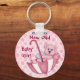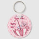 Sweet baby girl keychain for New Dad with adorable pink teddy bear riding in an umbrella, big dots and other special touches. Customise with Your information.