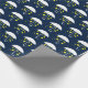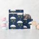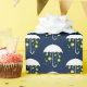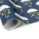 Wrapping paper with a pattern of with a white umbrella that is showering out smiling lemons and green leaves on a blue background.
