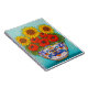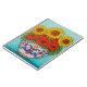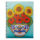 Stylised vibrant sunflowers & poppies in a beautiful Umbrian Deruta ceramic vase by Lisa Lorenz on a notebook