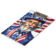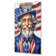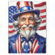 Smiling uncle Sam USA American Icon wearing an American suit and a waving American flag in the background