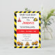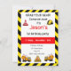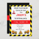 Under construction Concrete mixer Birthday party invitation personalised, this unique design have a unique concrete mixer, under construction tape and a construction helmet. The construction tape is wrap around the borders on front on the back a black solid colour with text you're invited. This design can be personalised with text and name. Matching items available in the store collection
