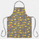Under construction road work transportation work vehicles all over print apron. Fun yellow and orange dump trucks, excavators, road signs pattern.