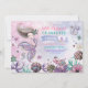 Girly under the sea themed birthday invitation featuring a cute little mermaid, sea turtle, narwhal, seahorse and other magical underwater critters and sparkly seagrasses