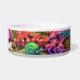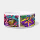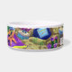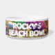 Under the Sea Personalised Pet Bowl designed for a second doggy bowl at the beach, the beach house, or beach bungalow. The bold words in white over the fun ocean sea life artwork is a template for you to change to your pet's name and location or to say anything you want. The fun artwork behind the bold words was digitally painted by our talented kid's book illustrator, Traci Van Wagoner, and shows a variety of fish, coral, crab, eel, anemones, and some silly stuff, like a TV, a cat, a bowl of popcorn, and a cute orange starfish on a beach towel wearing cool sunglasses.