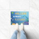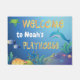 Welcome mat for children's playhouse with sea creatures under the sea ocean design. Edit the name. The colourful image shows an underwater scene with a sea turtle, dolphin, octopus, and several fish and coral. Great for little ocean lovers!