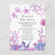 Pink and blue ocean themed beach wedding guest details cards featuring sea ferns, seaweed, coral, shells, anemones and starfish designed to be quickly and easily customised to your event specifics.