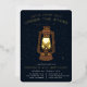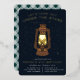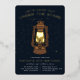 Cool camping themed birthday party invitations for your little one's backyard celebration feature a golden glowing camp lantern illustration set against a night sky dotted with gold foil stars. "Let's camp out under the stars" appears at the top, with your party details along the bottom.