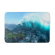 A massive wave leaps up from rough seas, sparkling white and blue and turquoise in the blazing sunlight. Under the wave, about to be submerged, is a little town with a castle and mediaeval cottages built on a rocky headland.