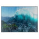 A massive wave leaps up from rough seas, sparkling white and blue and turquoise in the blazing sunlight. Under the wave, about to be submerged, is a little town with a castle and mediaeval cottages built on a rocky headland.