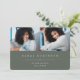 Simple and modern graduation photo announcement features two photos aligned side by side, with the graduate's name, school, and class year beneath in white lettering on a dark sage green background. Your graduate's name and school appear beneath. Add a personal message to the back, along with an additional photo.